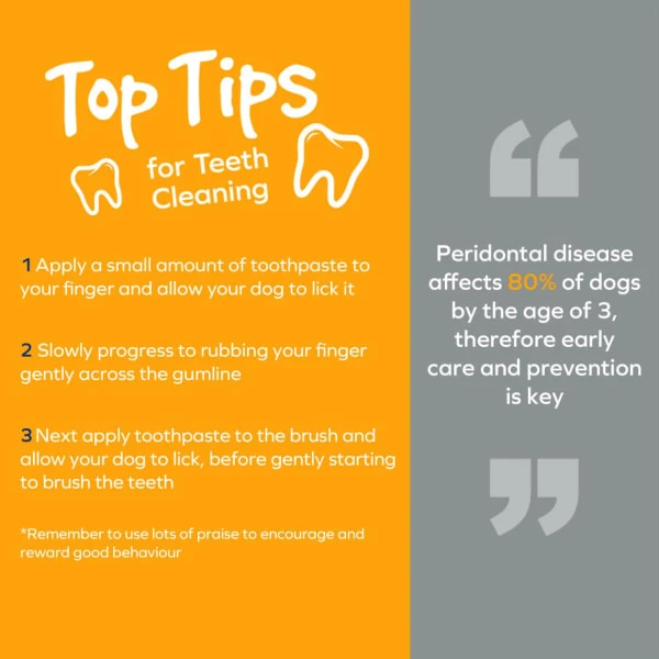 For first time users start by applying a small amount of toothpaste to your finger, and allowing your dog to lick. Slowly progress to rubbing your finger gently on the gumline. When your dog is comfortable, add a pea sized amount of toothpaste to both sides of the brush, and gently brush the teeth with a back and forth motion.