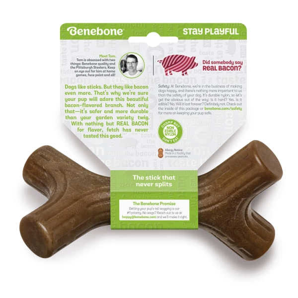 Tougher than real sticks and flavoured with real bacon, the Bacon Stick is sure to upgrade your pup’s chew and fetch game. At Benebone, we started with the premise that dogs experience scent and flavour in a way we can’t even grasp. So we ditched the neon colors and loud squeaks. Inspired by a dog’s powerful sense of smell, we developed a long-lasting durable chew that’s jam-packed with real bacon. Once your dog takes a bite of our USA-made chews, he’ll be hooked. We’re Obsessed with Safety Too. Wonder if Benebone is right for your dog? Here’s what you need to know. Since it’s hard, it’s important that your pup has strong teeth. If you’re unsure, check with your vet. Nobody likes an unexpected trip to the dentist. Keep an eye out for wear and tear. Within a month or so, we find that most dogs chew Benebone into submission. See the wear page on our website for helpful photos to determine when to replace yours. Keep away from households with peanut or other allergies. What’s Inside? Nothing but Nylon and Real Bacon for Tantalizing Flavour.