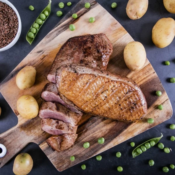 Composition: Fresh duck (55%), Potatoes (26%), Peas (9%), Duck fat (4%), Duck stock (1%), Linseed (1%), Brewer’s yeast (1%), Beet pulp (1%), Sunflower oil (1%), Minerals, Vitamins, Yucca schidigera extract (0.3%), FOS (0.1%), MOS (0.1%).