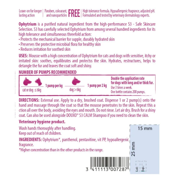 Mousse with a high concentration of Ophytrium for dogs and cats with sensitive, itchy or irritated skin: soothes, equilibrates and protects the skin. Hydrates, restructures, helps to detangle the fur and leaves the coat soft and shiny. No rinse Mousse with a high concentration of Ophytrium for cats and dogs with sensitive, itchy or irritated skin: soothes, equilibrates and protects the skin. All DOUXOS3 products are paraben, soap, sulphate, nanoparticle, colourant and phthalates free.