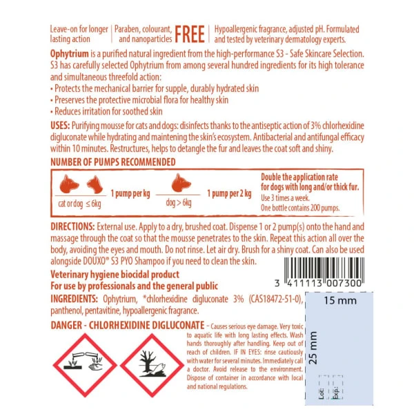 External use. Apply to a dry, brushed coat. Dispense 1 or 2 pump(s) onto the hand and massage through the coat so that the mousse penetrates to the skin. Repeat this action all over the body, avoiding the eyes and mouth. Do not rinse. Let air dry. Brush for a shiny coat. Can also be used alongside DOUXO® S3 PYO Shampoo if you need to clean the skin.