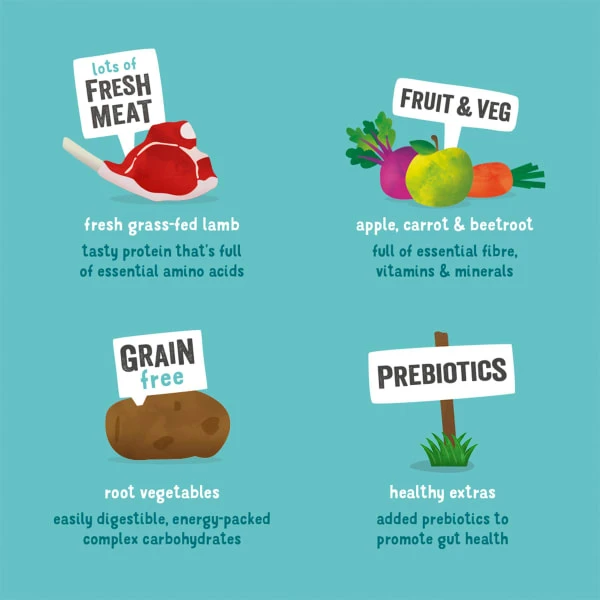 Composition: Fresh lamb 41%, potatoes, peas, pea protein, linseed, lamb gravy, sunflower oil, minerals, potato protein, fish oil, mannan-oligosaccharides (mos), fructo-oligosaccharides (fos), carrots 0.04%, apples 0.04%, pear 0.04%, broccoli 0.04%, banana 0.04%, kale 0.04%, spinach 0.04%, beetroot 0.04%, blueberries 0.04%, marigold blossoms, nettle, blackberry leaves, fennel, caraway, chamomile, balm.