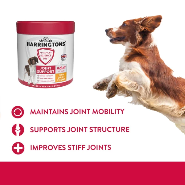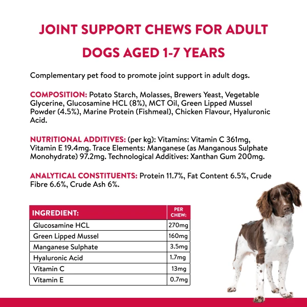Joint support chews for adult dogs aged 1-7 years. Complementary pet food to promote joint support in adult dogs. Green lipped mussel provides an incredibly concentrated source of Omega 3, proven to soothe stiff joints.