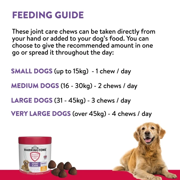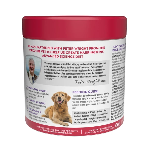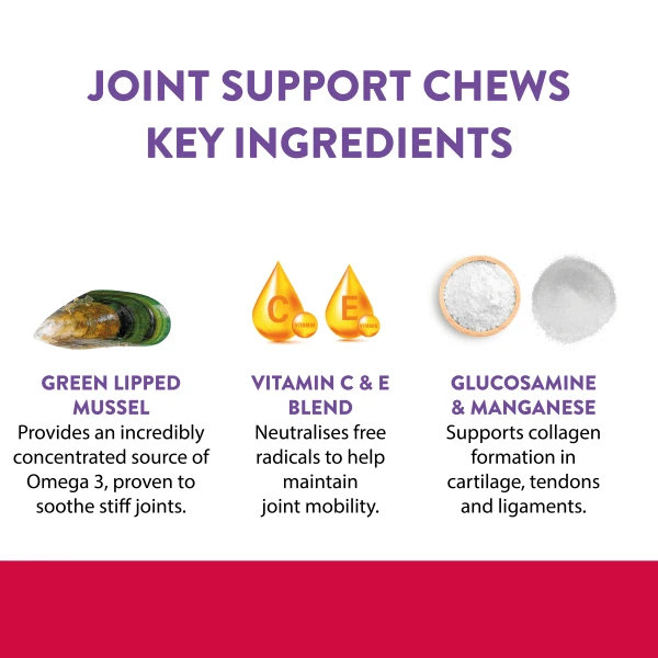 Joint support chews for adult dogs aged 7 years+. Complementary pet food to promote joint support in adult dogs. Green lipped mussel provides an incredibly concentrated source of Omega 3, proven to soothe stiff joints.