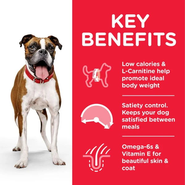 - Dog food with precise nutrition for less active adult dogs requiring a low calorie food