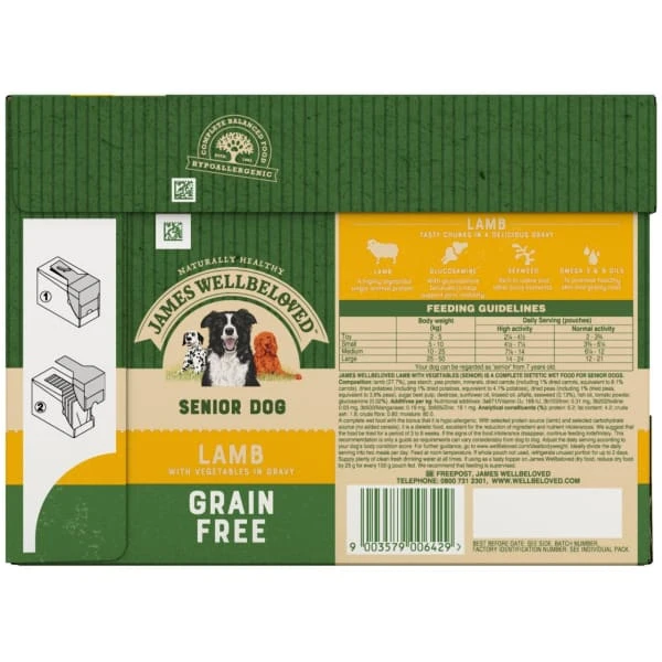 At James Wellbeloved we put a lot of love into creating recipes dogs will love. Using only simple ingredients and inspired by nature, our moist, wet dog food has all the goodness they need and nothing they dont. And, to minimise the risk of adverse food reactions, its naturally hypoallergenic. Best of all, you can be sure your canine friend is enjoying a balanced diet. One that not only tastes good, but does them a world of good too. Carefully crafted and nutritionally balanced complete senior wet dog food pouches for the health and wellbeing of senior dogs from 7 years. (over 10 years for small and toy).