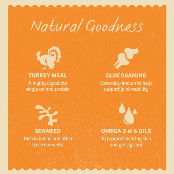 Composition: Turkey (29.8%), pea starch, pea protein, dried carrots (including 1% dried carrots, equivalent to 8.1% carrots), dried potatoes (including 1% dried potatoes, equivalent to 4.1% potatoes), dried peas (including 1% dried peas, equivalent to 3.8% peas), sugar beet pulp, dextrose, minerals, sunflower oil, linseed oil, alfalfa, seaweed (0.13%), fish oil, tomato powder, glucosamine (0.02%).