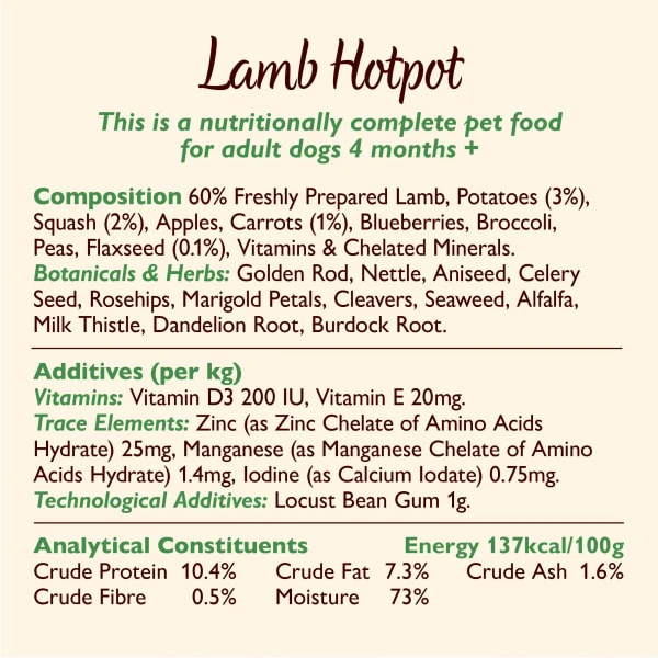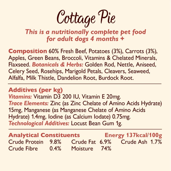 - Multipack of nutritionally complete, wet dog food – cottage pie, chicken & turkey casserole, lamb hotpot, sunday lunch