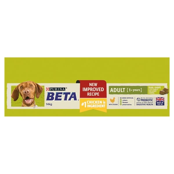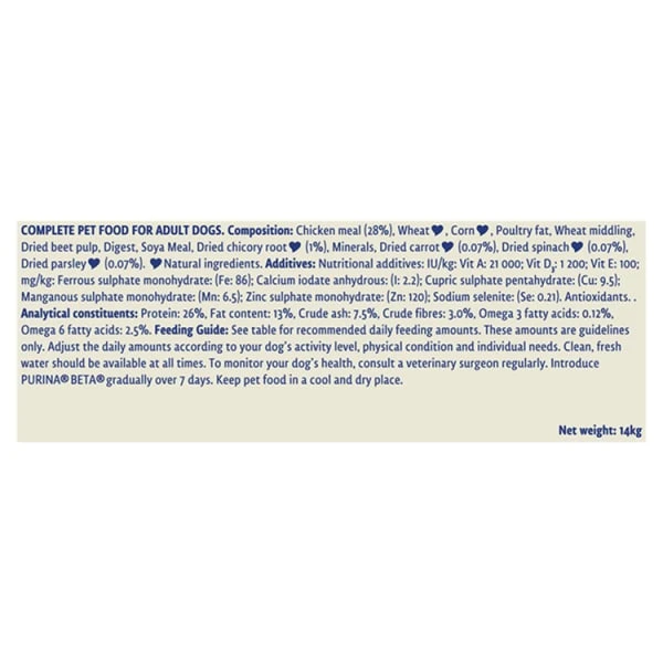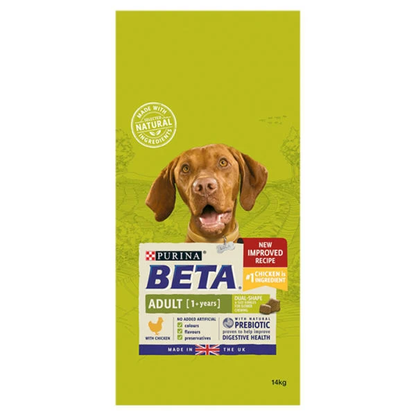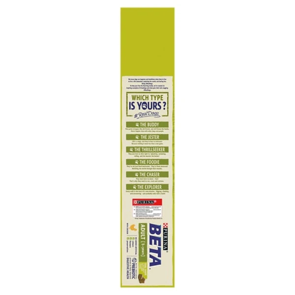 Being a Real Dog means running, jumping, chasing, and living a life unleashed. So he needs a food that can properly fuel his natural enthusiasm for life. That is why our Purina® Beta® tailored nutrition for adult dogs includes essential vitamin and minerals to help support healthy bones, and high levels of protein and fat to help support muscle maintenance. It is also specially formulated with selected natural ingredients and a natural prebiotic to support digestive health to keep your adventurous dog at his best all day long! And all this without including any added artificial colours, flavours and preservatives.