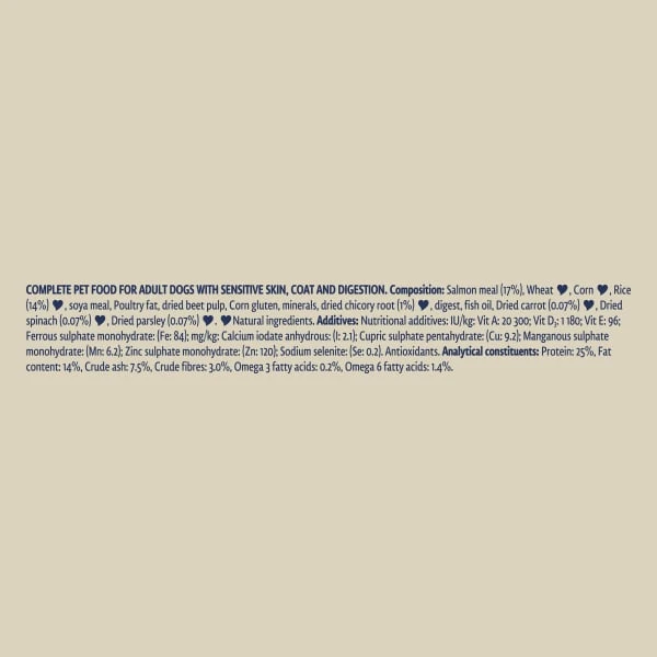 Salmon meal (17%), wheat, corn, rice (14%), soya meal, poultry fat, dried beet pulp, corn gluten, minerals, dried chicory root (1%), digest, fish oil, dried carrot (0.07%), dried spinach (0.07%), dried parsley (0.07%).