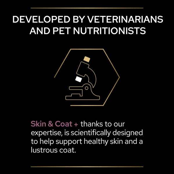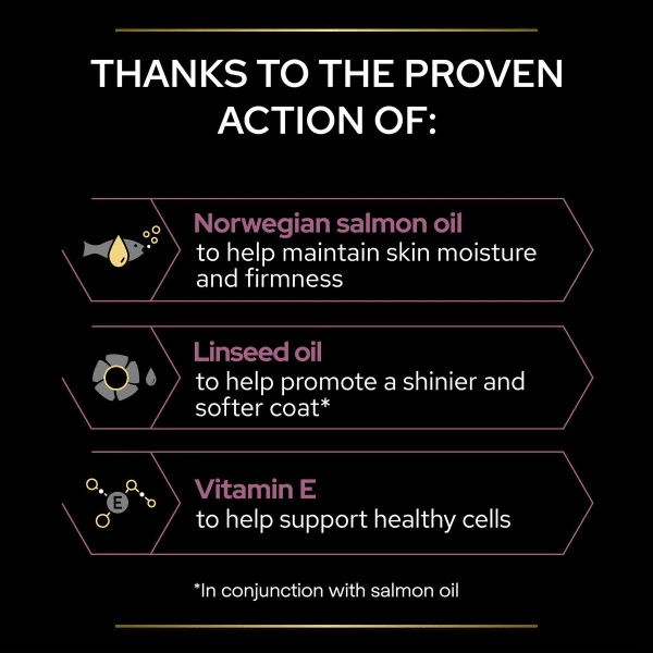 Pro plan Skin & Coat + helps nourish your dog’s skin and coat from the inside out, as it contains key nutrients (such as omega 3 & 6 fatty acids from Norwegian salmon oil, linseed oil and vitamin E), and is scientifically designed to