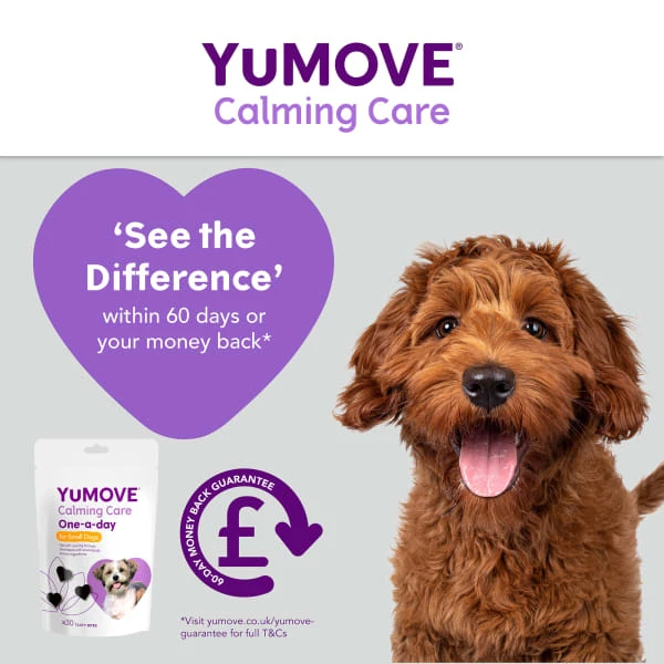 Keep your dog’s tail wagging with YuMOVE Calming Care One-a-day for Small Dogs, previously YuCALM One-A-Day. This unique formula contains natural, scientifically proven ingredients, providing an effective way to help reduce stress, support calm behaviour and ease anxiety.